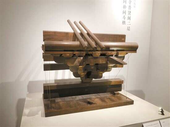 展览现场介绍,模型整体用楠木制作,造型平正、结构完备,各部分结合严密,构件表面顺滑平整、边棱挺正。杀瓣、榫卯等细微处均制作完备,体现了五铺作斜拱双抄重棋计心造的做法,为研究金代文物建筑提供了重要参考。