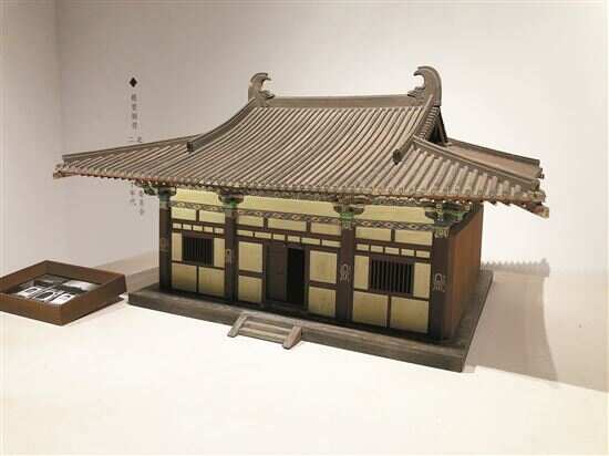 展览现场介绍,模型使用松木制作,是对形制(包括彩画)进行复原的研究性模型。梁、柱、瓦面、吻兽、斗棋、门窗等装修构件依据研究资料制作。模型柱身卷杀、侧脚、生起均有体现,斗栱制作精巧,各部分结合严密,瓦面、正吻等细部制作完备。整体造型优美,呈现出唐代建筑特征。