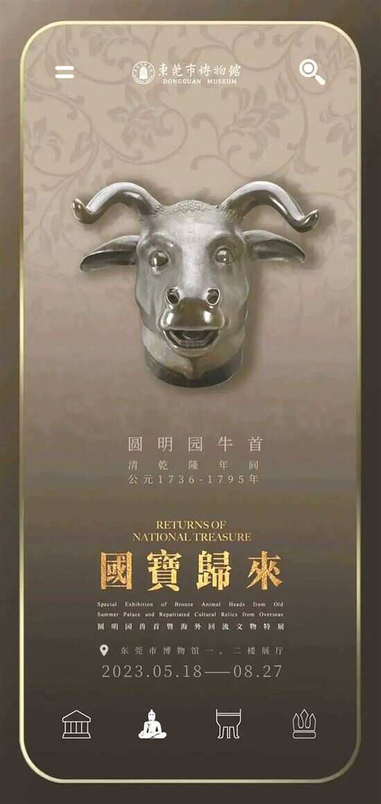记者从东莞市博物馆和“生活艺术地图”获悉,由东莞市博物馆与保利艺术博物馆、北京市海淀区圆明园管理处联合推出的“国宝归来——圆明园兽首暨海外回流文物特展”,已于5月18日开幕,展览展出86件珍贵文物,包括清代圆明园海晏堂十二生肖之牛首、虎首、猴首、猪首、马首,以及商周时期青铜重器、南北朝青州佛造像、明清藏传鎏金铜佛等。