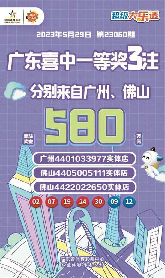 5月29日,体彩超级大乐透开奖,当期广东迎来大丰收,共中出3注580万元头奖,其中2注落户佛山,1注落户广州,可惜中奖者均未追加,白白错失多中80%奖金的机会。