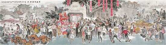 画面精心于国画传统笔墨基调上严谨地塑造人物形象,全幅画面里,80多个人物,身份各异、动态多样,但人物样貌基本是真实的,有相应的现实模特。画面场景开阔、深远,老城新貌一湾珠水尽收笔底,视觉冲击力强。主办方在作品说明中写道:“用墨用色更为反复推敲,画面上部沿袭国画留白,万里晴空,无限遐想。底部一片草绿,寓意一片盎然生机,新国画新面貌。”