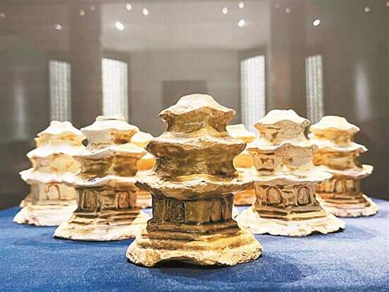 ■青釉佛塔模型,唐五代(公元618-960年),广州市第一人民医院改扩建项目工地G1出土。部分青釉脱落。平面呈六角形,塔基由基座和三级基台构成;塔身三层,仿楼阁式,首层开龛,龛内塑坐莲佛像;攒尖顶,塔刹残。其中一件底部有铭文。 潘玮倩/摄