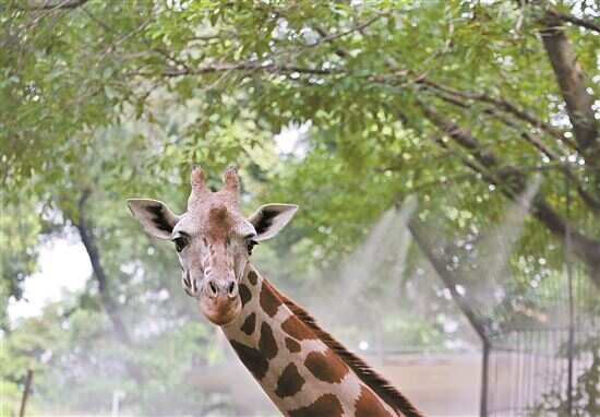 记者看到,草食区的长颈鹿在喷淋降温装置下,享用着保育员为它们准备的解暑蔬菜、水果。据悉,喷淋装置在室外温度达到32摄氏度后就会启动,增加空气湿度以达到局部降低温度的效果。