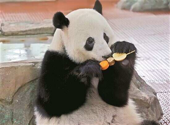 当室外温度高于26℃时,广州动物园的熊猫就会被安排进了空调房。记者看到,保育员在冰块上放了新鲜的南瓜、胡萝卜、哈密瓜、苹果以及冻住的青瓜、南瓜、苹果汁,还摆出了漂亮的造型,有的果蔬更是用竹签串起来,方便大熊猫“撸串”。