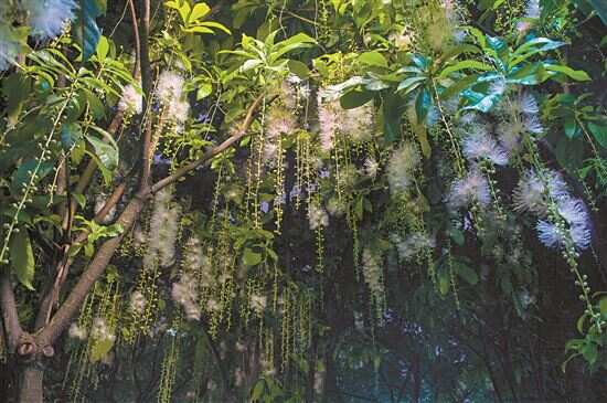 玉蕊花开的时间一般为下午太阳落山后至第二天早上太阳出来前。傍晚花苞满满,半夜灿若烟花,清晨太阳升起花儿凋谢。掉落时的玉蕊花如同天女散花,美得短暂却不匆忙。