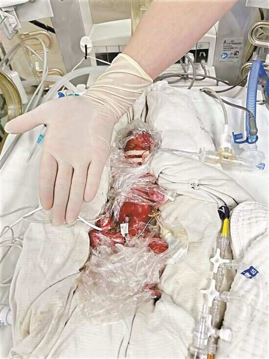 很快,顾女士剖宫产娩出一名男婴年年,他出生时体重只有385克,全身皮肤呈透明胶冻状,大腿只有成人的食指那么粗,嘴巴只有花生米般大小,整个身体还没有成人的巴掌大,呼吸微弱,救治难度极大。