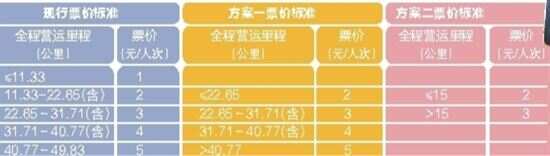 ●调价影响:对应人次票价约为1.67元,增幅为33.32%。根据评估,方案二将票价简化为2元、3元两个层级,取消分段收费,实行一票制。相对于现票价政策,公交基础票价有升有降。11.33公里以下线路票价由1元升至2元;11.33公里~15公里线路票价不变;15公里~22.65公里线路票价由2元升至3元;22.65公里~31.71公里线路,现长距离出行乘客票价3元保持不变,短途出行的乘客票价由2元升至3元;31.71公里以上线路,现长距离出行的乘客票价由4元、5元下降至3元,短途出行的乘客票价由2元升至3元。