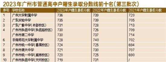 据广州市招考办统计,第三批次共有86所公办普通高中(含校区),其中16所公办普通高中(含校区)的户籍生录取最低分数所处梯度较2022年降低,5所公办普通高中的户籍生录取最低分数所处梯度较2022年上升。广州市第七中学、广州中学、广州市天河外国语学校、广州市玉岩中学、广东仲元中学的户籍生录取最低分数在700分以上。