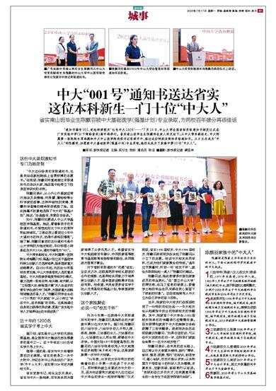 “通知书编号001、纪念砖拼图为‘红色中大1924’……”7月16日,中山大学全国首封录取通知书颁发仪式在广东实验中学(以下简称省实)高中部举行。省实南山班毕业生陈麒羽在家人的见证下,从中大常务副校长、中大附属第一医院院长肖海鹏和中大中山医学院党委书记张琪手中,接过这份特别定制的录取通知书。从小立志成为“中大人”的陈麒羽,如愿被中大基础医学(强基计划)专业录取,她因此成为了家族中第10位“中大人”。