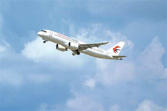 C919大型客机是我国首次按照国际通行适航标准自行研制、具有自主知识产权的喷气式干线客机。国产大飞机翱翔蓝天,画出了最动人的航迹。