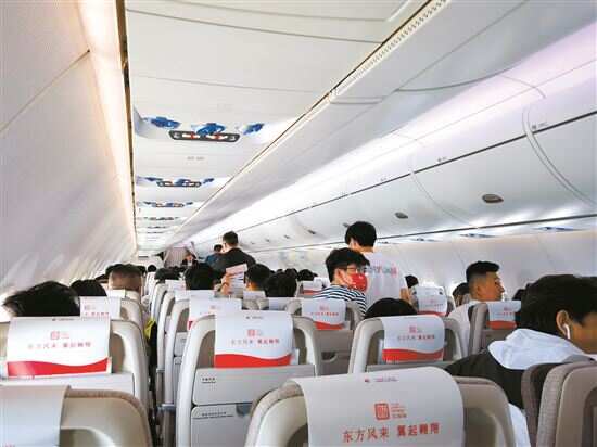 执行商业首飞的C919飞机为164座两舱布局,公务舱8座,经济舱156座。客舱内饰、旅客座椅、机载娱乐系统和飞机外部涂装做了定制化设计。
