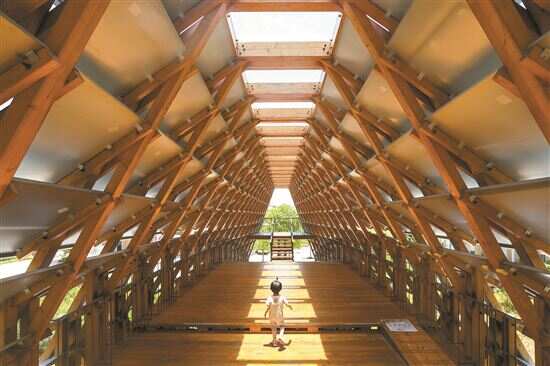 ■屡获殊荣的木制拱桥“侨一桥”采用中国传统建桥技术中的拱形结构,过桥时从两端入口走到廊桥中心沉浸于光影,静谧而阔朗。