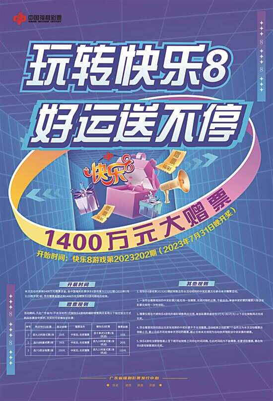 新快报讯 记者陆妍思 通讯员莫冠婷报道 今年5月,广东省福利彩票发行中心在省内(不含深圳市)开展“玩转快乐8,好运欢乐送”中国福利彩票快乐8游戏1000万元赠票营销活动,受到广大彩民的喜爱和支持。为进一步回馈彩民,广东福彩将自中国福利彩票快乐8游戏第2023202期(2023年7月31日晚开奖)起,在全省范围内(不含深圳市)再度开展快乐8游戏赠票活动——“玩转快乐8,好运送不停”,本次活动共安排1400万元赠票资金,赠票金额已达到1400万元当期快乐8游戏期结后结束。