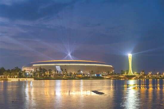 ■成都东安湖体育公园主体育场静候大运会开幕式的举行。新华社发