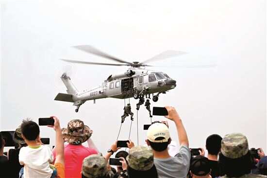 ■观众观看空降兵空中突击分队救援行动展示。
