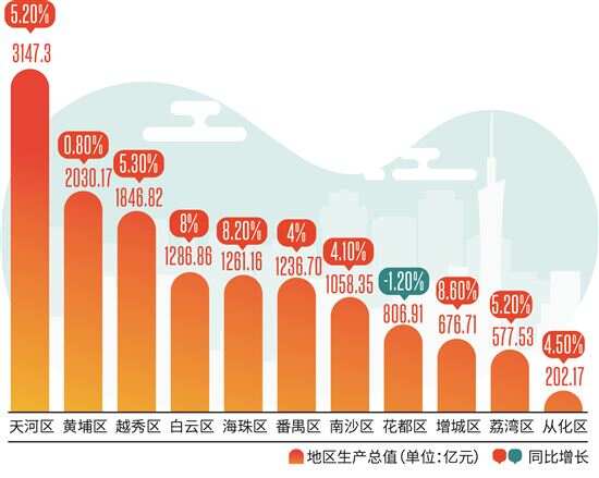 排名第二的黄埔GDP也超过了2000亿元,不过同比增速仅0.8%;越秀区排名第三,GDP达1800亿元,增速5.3%。