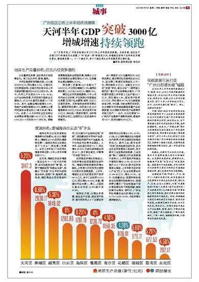 从7月底开始,广州各区陆续公布2023年上半年度经济数据。总体来看,地区生产总值(GDP)的排名变化甚微,广州“经济一哥”依然是天河,而增城区保持了近年的良好增长势头,增速排名第一。十一个城区中,有十个城区同比去年同期录得正增长值。