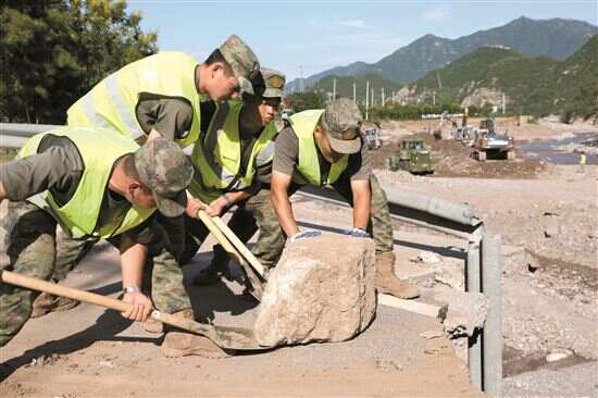 ■中部战区陆军第82集团军某工兵旅官兵在北京市昌平区流村镇清理道路(8月5日摄)。新华社发