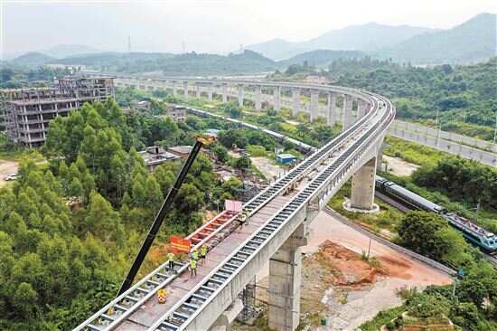 ■8月10日,广东清远磁浮旅游专线最后一榀轨排被吊装到横跨京广铁路的长隆特大桥上,标志着广东首条中低速磁浮线——清远磁浮旅游专线实现轨道贯通。初期工程线路长约8公里,设银盏站、莲湖站、长隆站3站,设计最高时速120公里,计划2023年底建成。新华社发