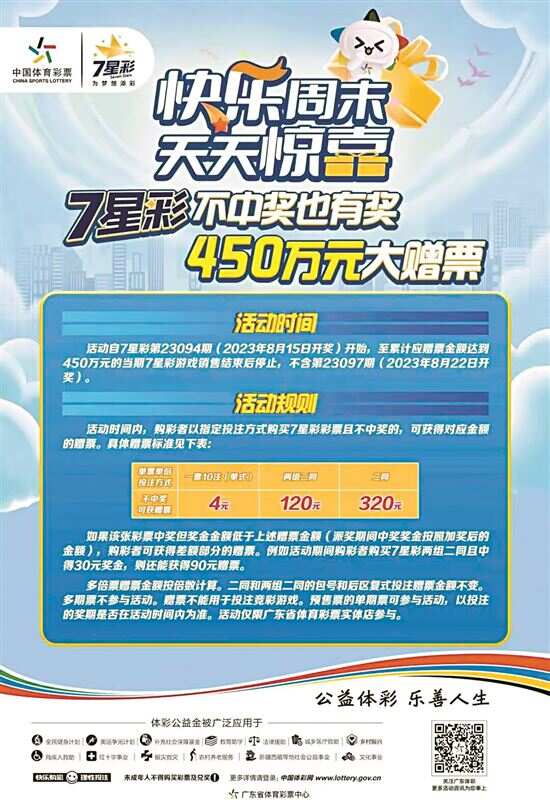此次赠票活动时间自7星彩第23094期(2023年8月15日开奖)开始,至累计应赠票金额达到450万元的当期7星彩游戏销售结束后停止,不含第23097期(2023年8月22日开奖)。