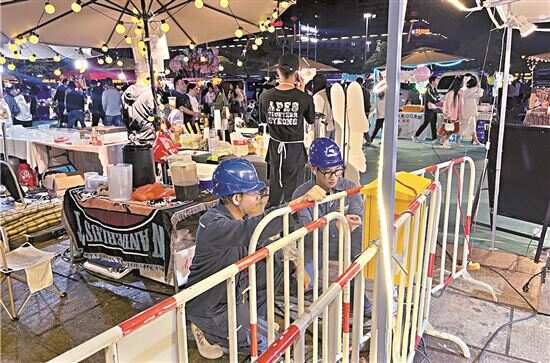 ■灯光节夜市,古镇供电分局配电运维班人员检查用电安全。