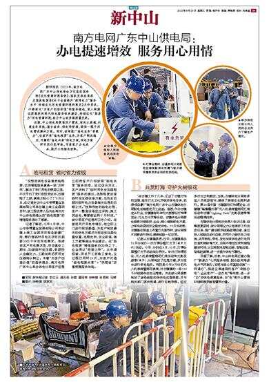 新快报讯 2023年,南方电网广东中山供电局全方位落实国务院《优化营商环境条例》、国家发展改革委及国家能源局《关于全面提升“获得电力”服务水平 持续优化用电营商环境的意见》文件要求,不断深化“为客户创造价值”的服务理念,深入构建优质高效的现代供电服务体系建设,持续优化“新易办”用电营商环境,助力中山经济高质量发展。