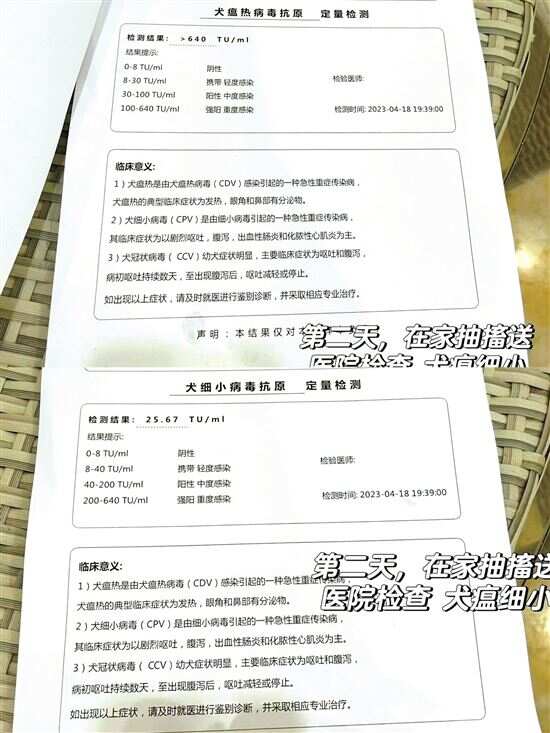 谭女士的泰迪犬患犬瘟热、犬细小病毒的检查报告。