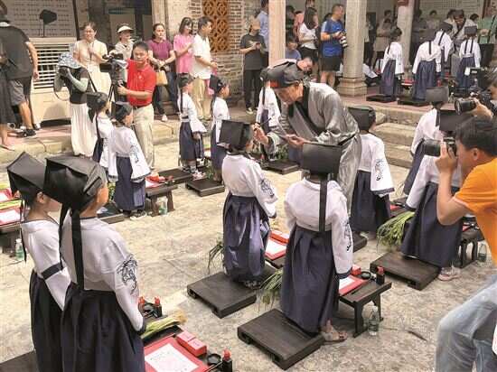 新快报讯 记者农艳芳 通讯员王坤报道 公祠内,百余名幼升小学童身着汉服,循着正衣冠、鞠躬行礼、朱砂启智、击鼓明志等礼仪步骤完成开笔礼;公祠外,大红灯笼装点古村落村道两边,传统文化创意集市摊位琳琅满目,特色农产品、非遗技艺成品、义卖手工艺品等“齐聚一堂”……