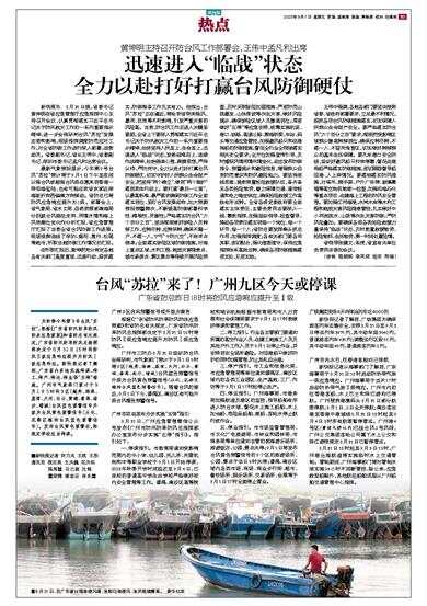 为防御今年第9号台风“苏拉”,根据《广东省防汛防旱防风防冻应急预案》和省防总有关规定,广东省防汛防旱防风总指挥部决定于8月31日18时将防风Ⅱ级应急响应提升为防风Ⅰ级应急响应。新快报记者了解到,广东省内多地实施停课、停工、停产、停运、停业等“五停”措施。广州市气象部门预计于9月1日5时将9区(越秀、海珠、荔湾、天河、白云、黄埔、番禺、南沙、增城)台风蓝色预警信号升级为台风黄色预警信号(从化、花都区维持台风蓝色预警信号)。发布台风黄色预警后,按规定学校应当停课。