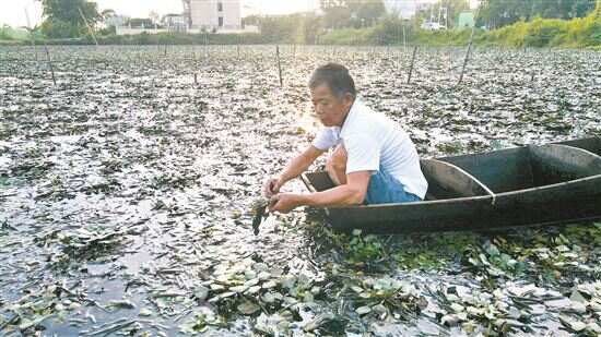 ■磷溪镇一名村民在菱角种植基地采摘菱角。