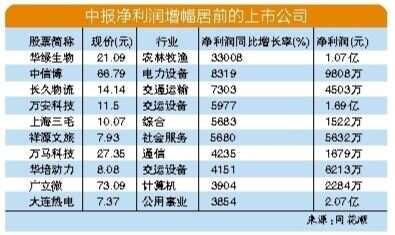 净利润增幅方面,2715家公司上半年净利润同比增加,占比超50%。642家公司今年上半年实现归母净利润同比翻番,以电力设备、机械设备、汽车和医药生物等行业居多。此外,有49家公司净利润同比增长超10倍。其中,华绿生物净利润增幅达330倍,中信博、长久物流、万安科技、上海三毛和祥源文旅净利润增幅均超50倍。