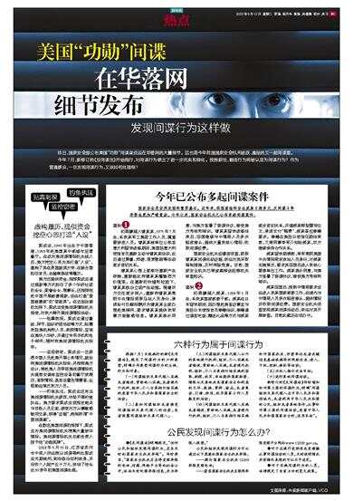 ●《反间谍法》明确规定,“任何公民和组织发现间谍行为,应当及时向国家安全机关举报”。同时要求,“国家安全机关应当将受理举报的电话、信箱、网络平台等向社会公开,依法及时处理举报信息,并为举报人保密。”