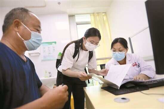 ■小庄陪同从河南来广州就医的刘伯(左一)看病。(资料图)新快报记者 郗慧晶/摄