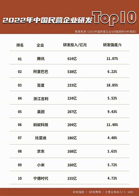 科技自主创新的重要性愈发凸显,民营企业不约而同持续加码科研投入。以腾讯为例,2022年其研发投入费用为614亿元,占当年税后净利润总额约50%,同比增长率达到18.3%。2018年至2022年,腾讯五年间累计研发投入累计超2200亿元。