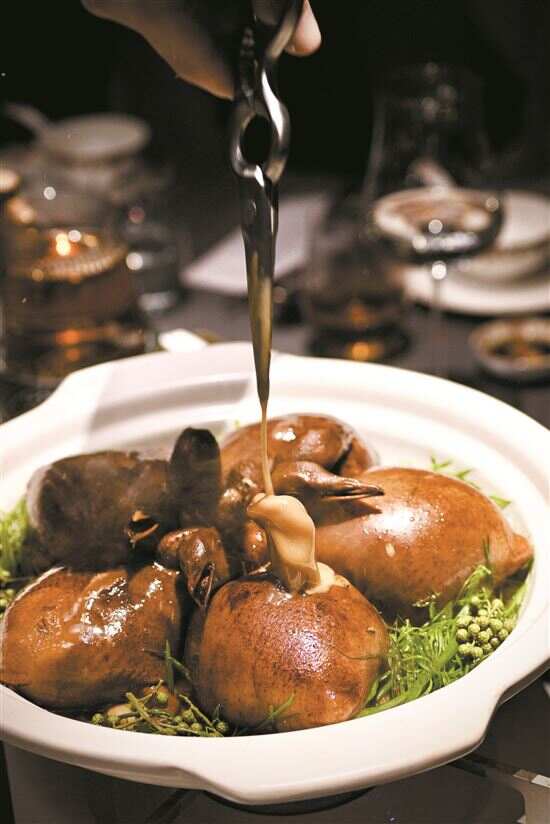 “爆”这个字,恐怕是御膳汤品的又一大关键词,除了汤料会“爆浆”,另外一道菜品、亦是招牌之一的齿留香黑松露鸽吞花胶公肚则会“爆汁”,它借鉴了传统菜品鸽吞翅的做法,把翅换成了肚,也就是花胶,被“撑”得满满当当的鸽子上得台面,御膳汤品主理人余毓根一剪刀下去,剪开鸽身的同时,如小型喷泉一般的汁水汩汩而出,十分有电影效果。