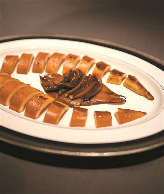 “博士养生茶”犹如开场白,拉开了同样延用“四时节令食养同源”思路设计的菜品序幕。百岁草炖珍珠鲍鱼、鹿儿岛本鲣汁2016年南非6头大网鲍、和歌山柚子醋60头北海道刺参、黑松露9年兰州百合焗澳洲水晶蟹、黑松露即烧黑棕鹅、长白山野生羊肚菌和牛猫牙米饭、鲜制90年满楼香酒雪糕等,通通是这里的招牌自创,道道有自己的精华值得细表。