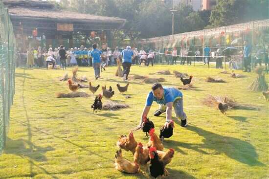 “很开心!”参加抓禽(鸡)比赛的村民蔡大叔笑得合不拢嘴,年过六十的他参赛热情不输年轻人。来自各镇街的选手在赛场上分组对决,一较高下,上演了“七擒七纵”的精彩好戏。赛场上,不时出现“人仰鸡飞”的场景,令围观群众捧腹不已。