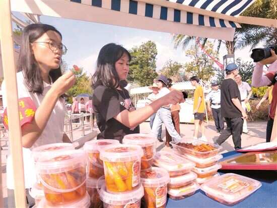 “中秋节快到了,今天就是来‘宠粉’的,一份释迦果只要19.9元,包邮到家……”在农事运动会现场特色农产品展销区,来自湘桥一家种植专业合作社的主播忙于带货,不停接单。