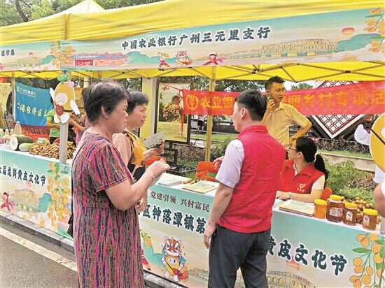▲在广州市白云区钟落潭镇第六届龙岗黄皮文化节现场,农行广州分行工作人员为市民和游客普及安全用卡等金融知识。