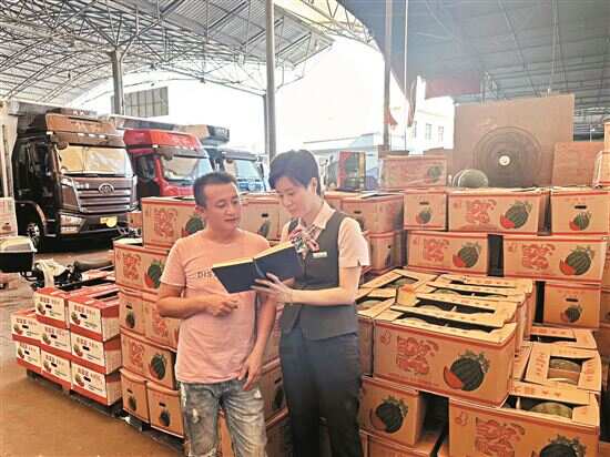 农行广州分行工作人员走访广州江南果菜批发市场,为西瓜批发商户详细介绍“惠农e贷”的申请流程。