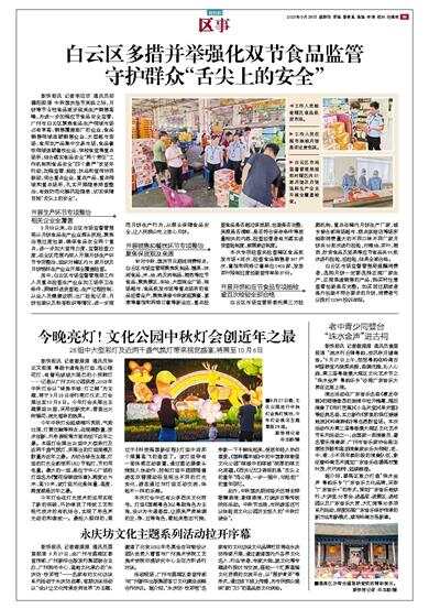 新快报讯 记者李应华 通讯员郑穗阳报道 中秋国庆佳节来临之际,月饼等节令性食品逐步迎来生产销售高峰,为进一步加强应节食品安全监管,广州市白云区聚焦食品生产领域市场占有率高、销售覆盖面广的企业,食品销售领域连锁销售企业、大型超市卖场、食用农产品集中交易市场,食品餐饮领域连锁餐饮企业、学校食堂等重点场所,结合落实食品安全“两个责任”工作机制和食品安全“四个最严”攻坚年行动,加强监管、抽检、执法和宣传协同联动,突出重点企业、重点产品、重点领域和重点场所,扎实开展隐患排查整治,有效防范化解风险隐患,切实保障百姓“舌尖上的安全”。