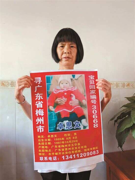 卓永军丢失后,卓旭良、卓运香夫妻俩选择一直留在惠州,除了全国各地搜寻,还想办法加入各种寻子团,通过上网发布寻子信息、录DNA入库等方式扩大寻子范围。在卓运香的鼓励和带动下,钟添英也一直没有放弃寻找小思文,只要听到有消息,她也会全力跟上,尽自己所能扩散寻子消息。然而,最让钟添英揪心的是,孩子丢失前,他们甚至都还没来得及给小思文拍一张正面照片,仅有的一张有小思文的照片里,只有他闯入时的一个小小背影。“以前太穷了,后来做生意时又太忙,根本没想过会发生这样的事情,当时只给他姐姐拍过照片,但是他们姐弟俩长得很像。思文最大的特征就是右手被开水烫过,留下有疤痕,脖子后面还有一粒痣。”钟添英说,无奈之下,他们只能拿着思文姐姐小时候的照片去发寻子启事。
