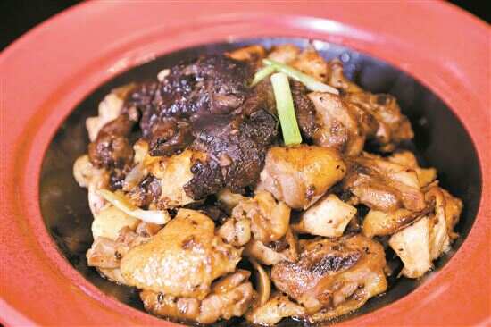 这道菜源自顺德煎焗菜式,在原有食材鸡的基础上,增加了山珍黑虎掌菌,菌子的香与鸡肉的香互为影响,加上师傅的妙手烹制,成为一道搭配别致、成品鸡肉外脆内里有嚼劲、口感十分特别的香口菜,“送饭送酒都一流”。