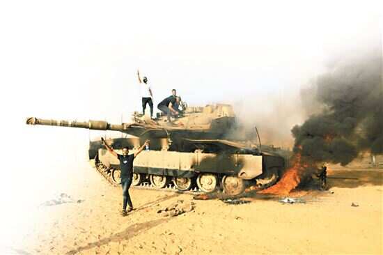 ■10月7日,在加沙地带城市汗尤尼斯以东的边境地区,巴勒斯坦人出现在一辆以色列坦克附近。新华社发
