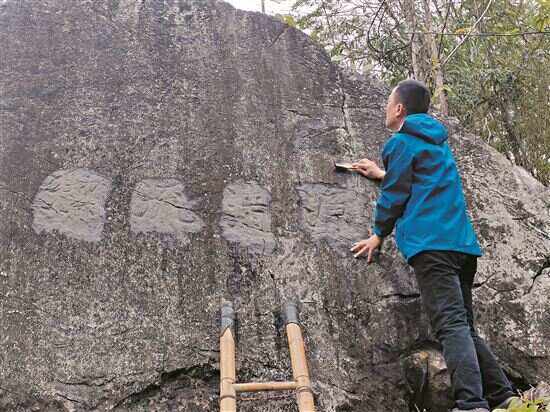 李香占用刷子清理山溪摩崖石刻表面的青苔。