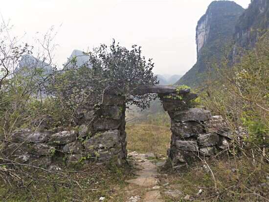 南岗古寨门,此寨门位于三排镇南岗行政村牛栏洞去千年瑶寨古道中段,建筑年代有待考证,据初步了解为明清建筑。