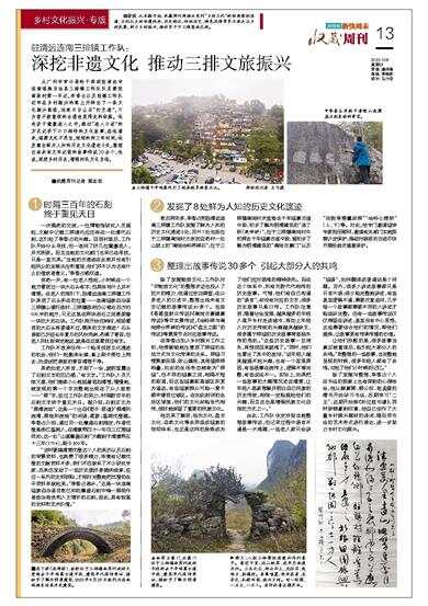 从广州市审计局的干部到驻清远市连南瑶族自治县三排镇工作队队员兼驻南岗村第一书记,李香占以及驻镇工作队近年在乡村振兴的路上开辟出了一条文化振兴路线,他终日与山石“打交道”,只为曾不被重视的古遗迹觅得史料依据。他走访于耄耋老人之中,通过“老人口述”的方式记录下口口相传的文化故事,在他看来,瑶寨无处不是宝,短短的两三年时间,他发掘出鲜为人知的历史文化遗迹8处,整理出尚未有文字记载的故事传说30余个,他说,深挖乡村历史,增强村民文化自信。