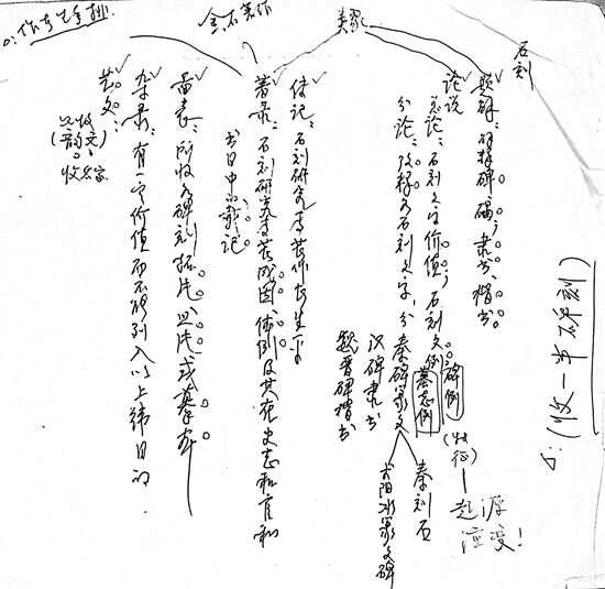 周春健:这些手稿的收藏主要通过两种途径:一是通过网上拍卖或到旧书店实地淘宝所得,另一个重要方式就是,自己参与《儒藏》《中华大典》等大型文化工程过程中所保留的相关原始档案或手稿。印象特别深的,展柜中有一柜展示的是《中华大典·语言文字典》副主编舒怀老师(湖北大学中文系教授)的一份手稿,应该是作于2008年,其时我还在湖北大学古籍所工作。记得很清楚,当时我就自己承担的“文字分典”中“石刻隶书分部”的编纂体例向舒怀教授请教,舒老师一边讲解,一边随手写下这一类目设置原则,一方面使我对“石刻隶书分部”的具体编纂工作做到了心中有数,另一方面使我对“类书”的体例也有了更直观的理解,在文献学理论及实践方面均获益良多。