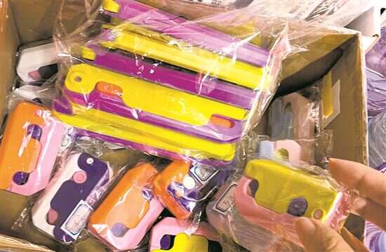 17时许,记者来到黄埔区某公办小学旁的小卖部,看到店里有萝卜刀售卖,价格多为四五元左右,款式除了最普通的萝卜刀,还延伸出了萝卜枪等玩具,此外也有不少萝卜刀形状的橡皮擦等文具。老板告诉记者,现在萝卜刀在短视频等社交平台上非常火,小孩子都很喜欢这个,几乎人手一把,很多小朋友看到好朋友有也会来买一把。