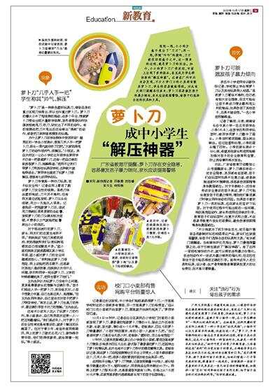 广州大学附属小学德育处副主任、心理老师冯妙然在接受新快报记者采访时表示,虽然在广大附小校园内没有发现萝卜刀的身影,但她关注到,萝卜刀与此前的捏捏乐、盘珠子等小物件一样,在小学生群体中“一阵风似的流行起来”。在她看来,这种风靡的背后实际上体现了一种小学生的“社交风格”:小物件可以让大家有共同话题,快速打成一片。“萝卜刀、手串等操作性的小物品在手里把玩的过程,有孩子表示很解压,这也可以看作是一种宣泄行为,或者是一种寻求关注的表达。”她呼吁更多的青少年教育者、父母看到这些“流行”行为背后孩子的需求,正确看待学生们表达出的压力状态,做好安全教育的引导。“我们要蹲下来、俯下身聆听孩子的需求,给他们营造一个平等交流的环境,跟着孩子一起成长。协助提供一些孩子更喜欢的方式来表达一些无法言语的情绪情感,如提供一些‘空白’时间单独让孩子自行支配、给予孩子适当的计划安排权利等。”冯妙然建议道。